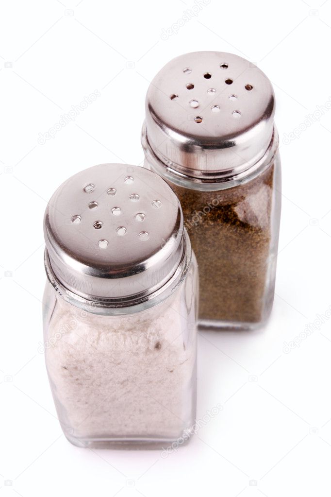A set of stainless steel salt and pepper shakes isolated on white.